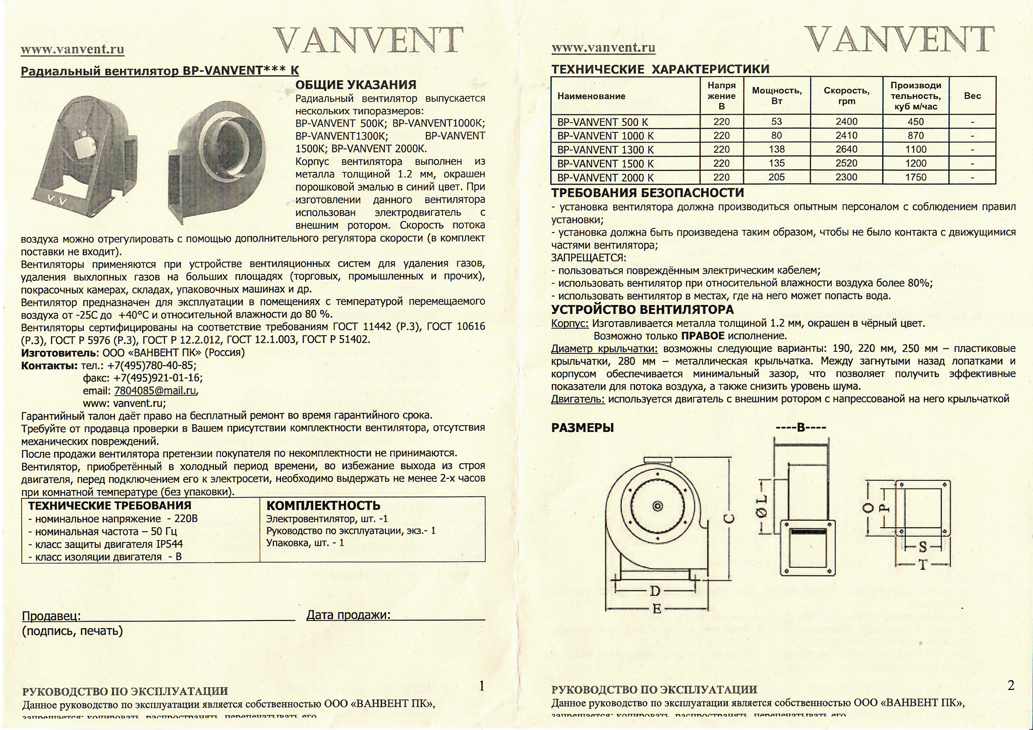 Вентилятор радиальный ВанВент BP-1000 К интересное:
