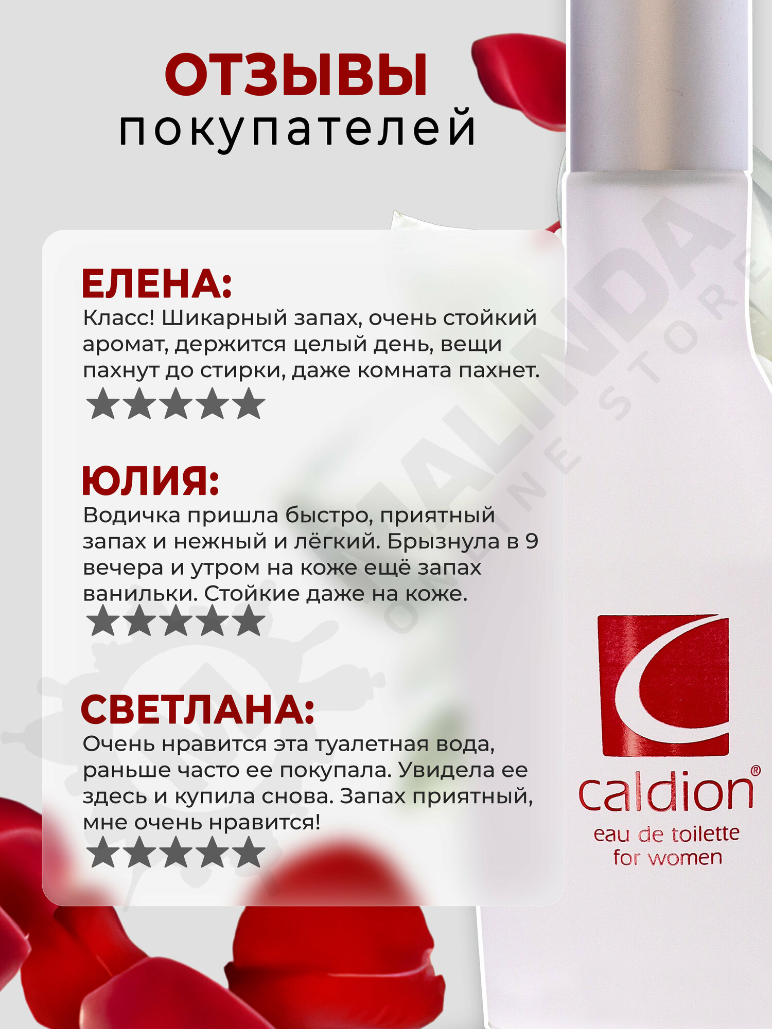 Ниже Вы можете прочитать отзывы на Caldion туалетная вода Caldion For Women, 100 мл, ознакомится с подробными характеристиками, посмотреть интересные обзоры и фотографии на Caldion туалетная вода Caldion For Women, 100 мл.