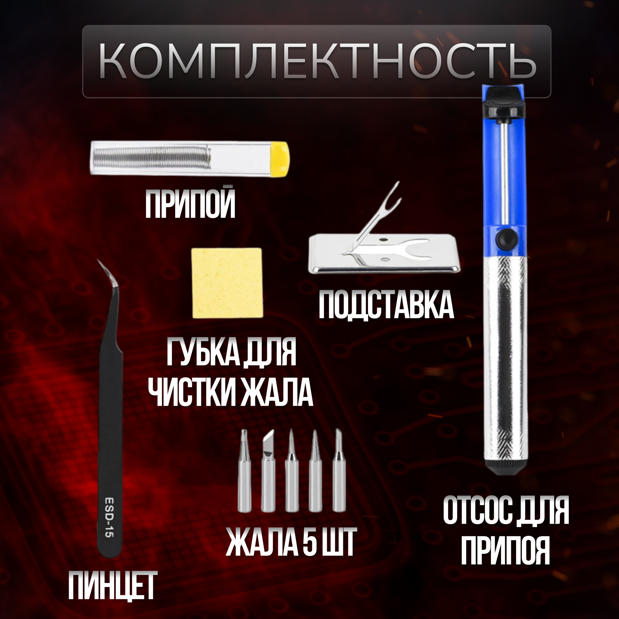 | Комплектация | паяльник; вакуумный экстрактор; пинцет; проволочный припой; подставка; губка для чистки жала; 5 сменных насадок; инструкция; кейс для хранения. |