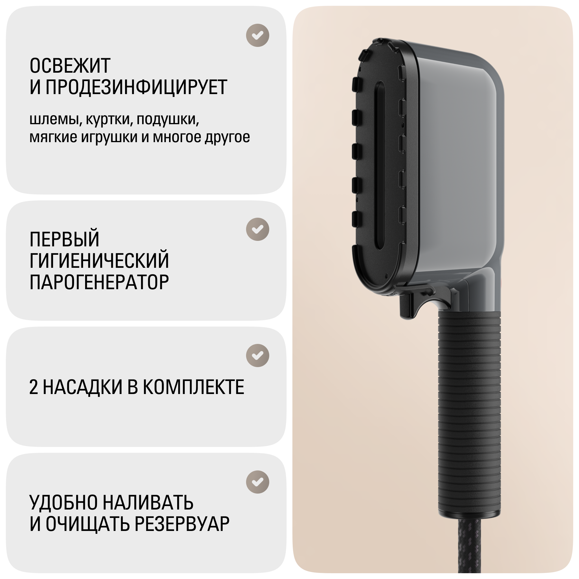 Все плюсы парогенератора (качество глажки, вертикальное отпаривание, резервуар для воды который можно пополнять во время глаженья, импульсная подача пара) |