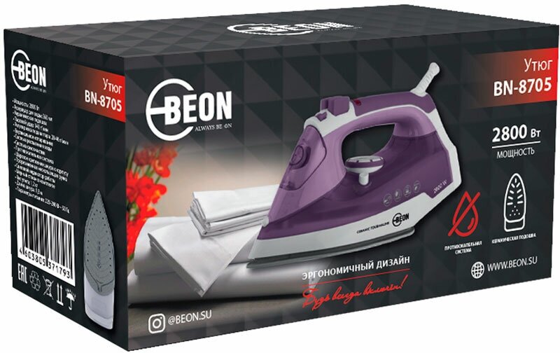 Утюг электрический BEON BN-8705, 2800Вт, подошва керамика, самоочистка, антикапля, резервуар 360мл