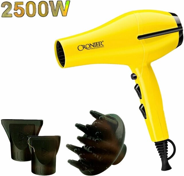 Профессиональный фен для волос, c ионизацией, 4 насадки,2500w, желтый интересное: