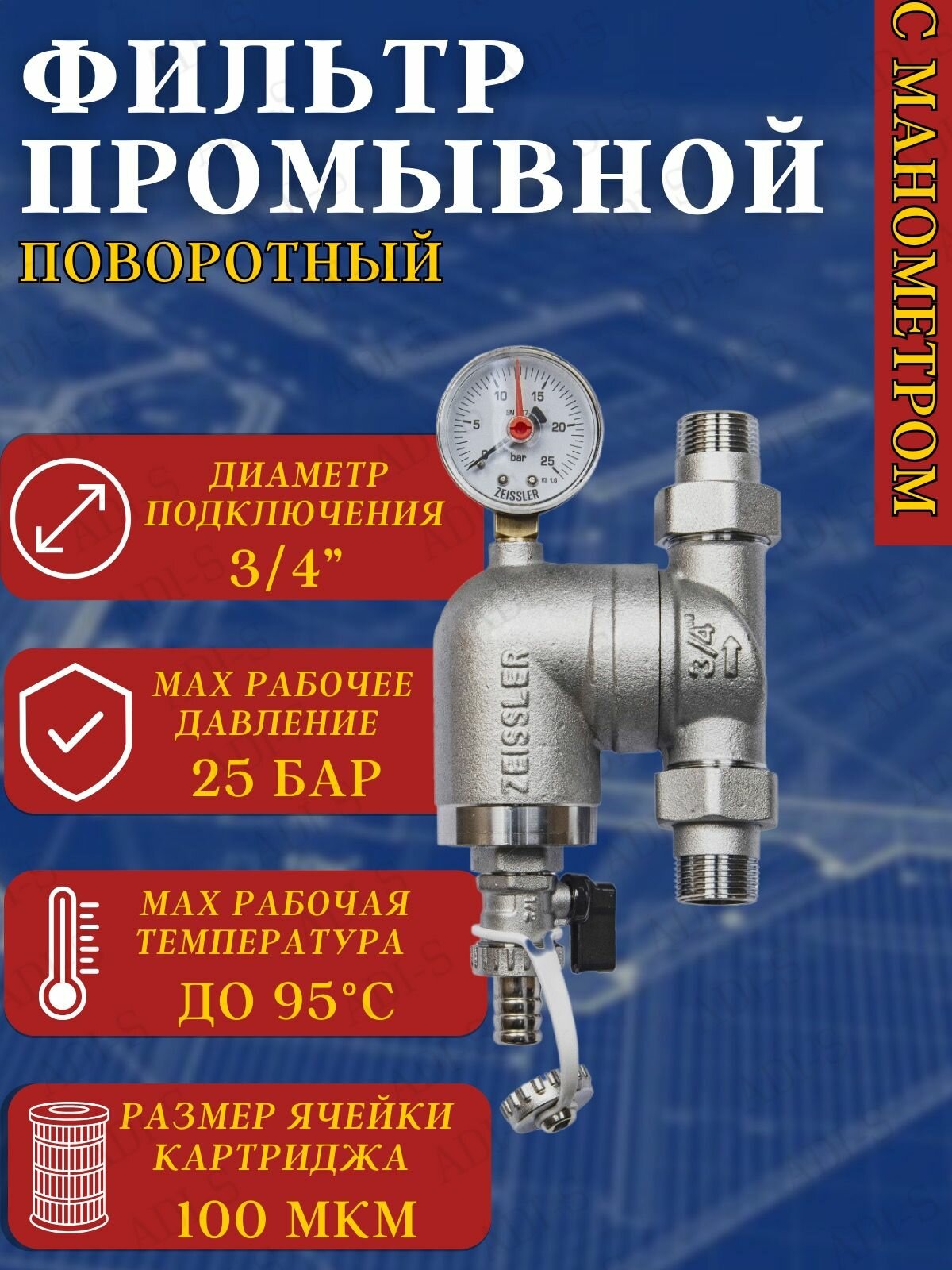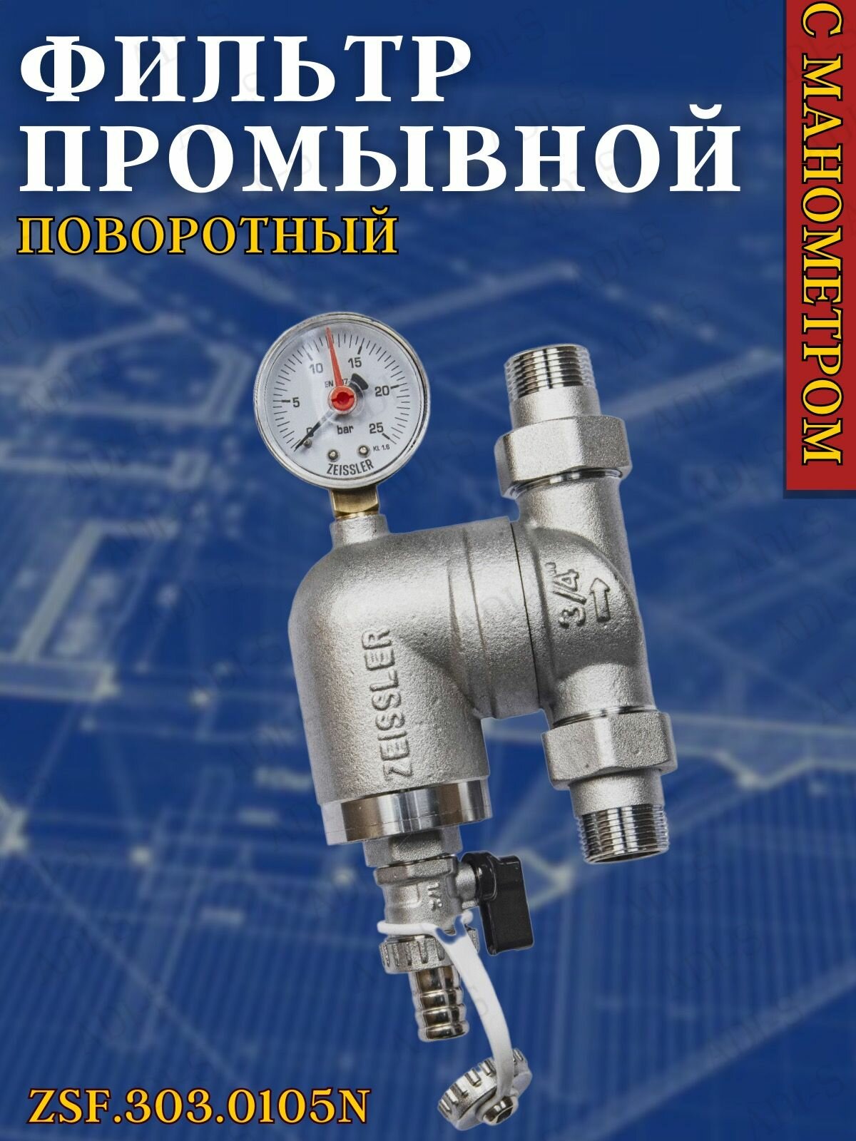 Купить Фильтр свободного вращения с манометром 3/4" ZEISSLER арт. ZSf.303.0105N