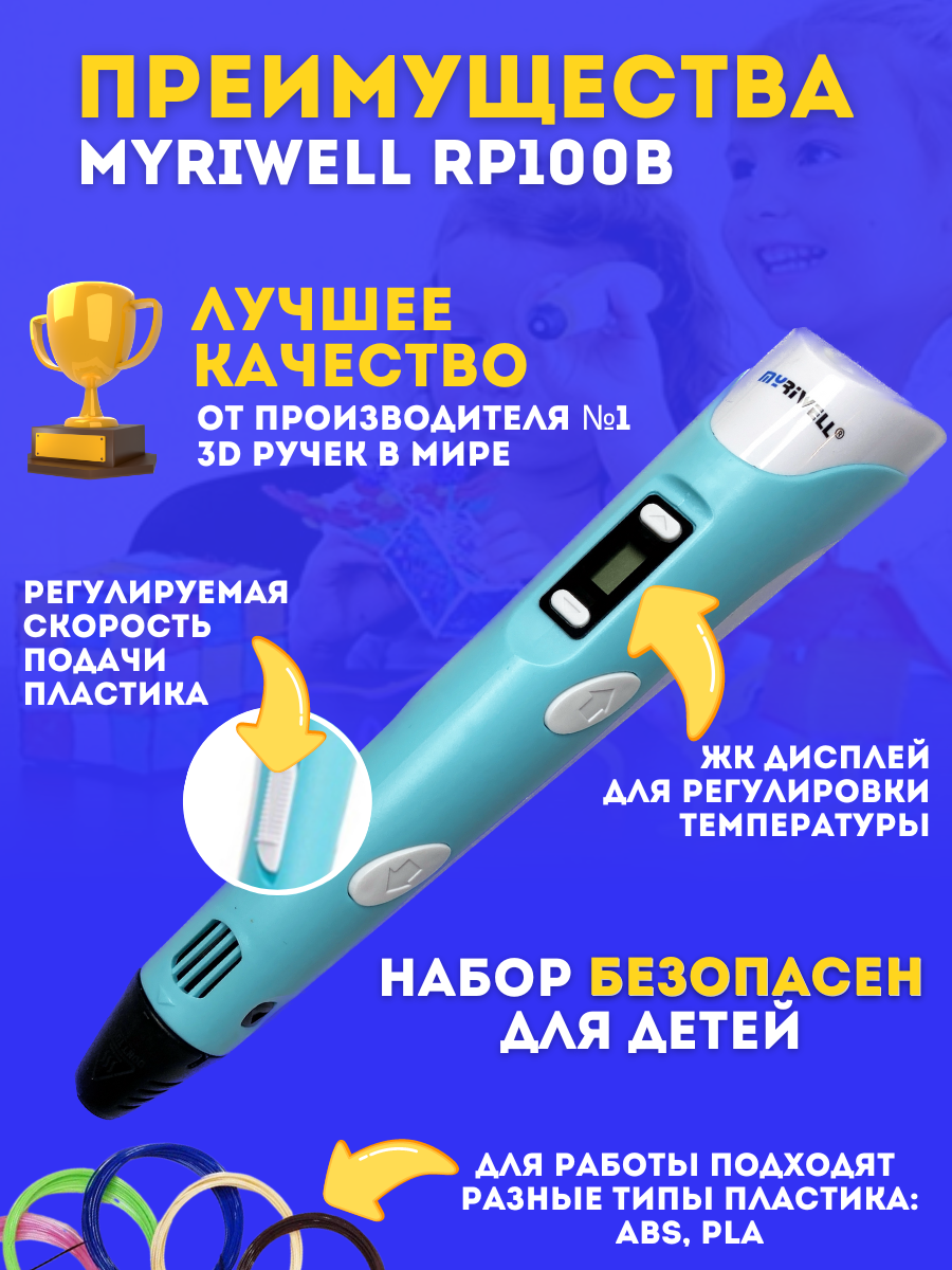 3Д ручки Myriwell 3D ручка Myriwell RP100B XXL + 20 цветов PLA пластика + книжка с трафаретами (40 штук) + 3D термоковрик + подставка + лопатка + 2 напальчника (Голубой)