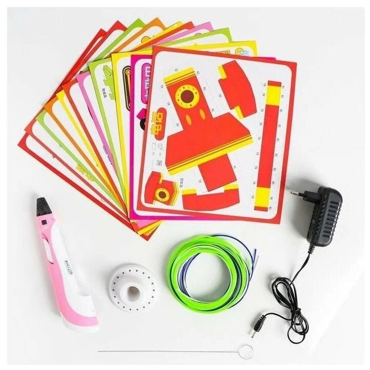 | Комплектация | 3d ручка, адаптер питания 220В, стартовый набор пластика (3 цвета), трафареты для 3Д печати, пластиковая подставка, инструкция на русском языке, шомпол |