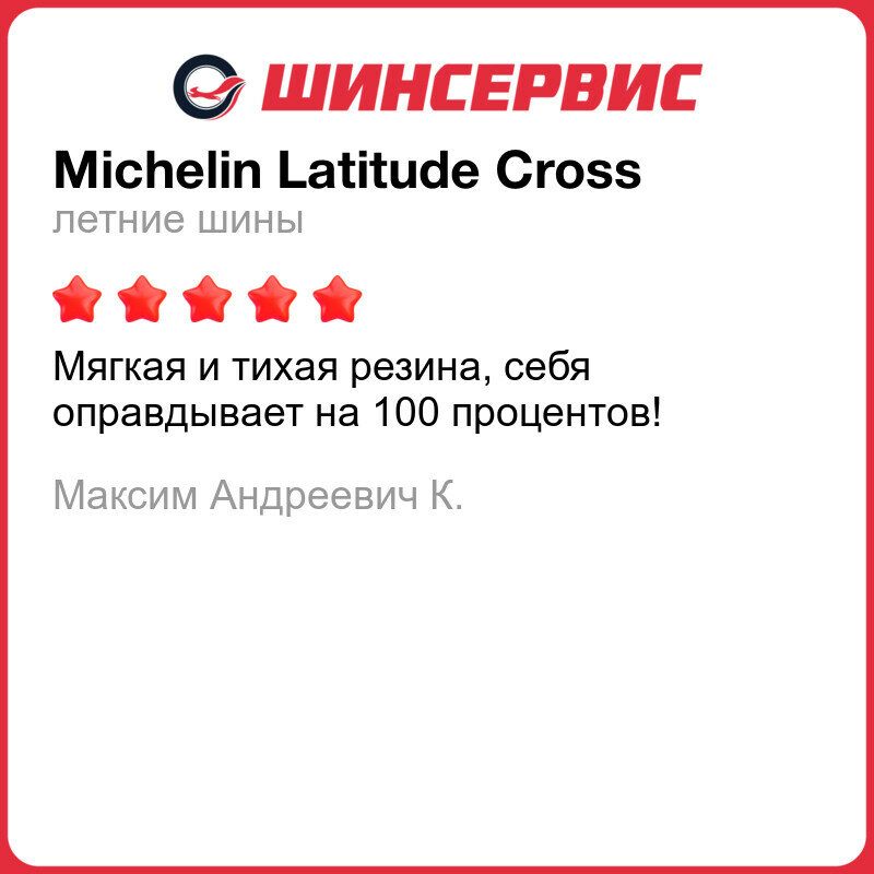 Резиной очень доволен как летом,так и зимой, экономия на переобувке, летом мягкая, боковина жесткая и высокая,на Красном Лимане Луганская обл., Украина(кто ездит знает какие ямы там были) влетел весной 2013г. в приличную яму при обгоне на скорости 100км. -у тещи чуть шея не провалилась-очень сильный удар, давление сделал перед дальней поездкой 2,5., грыжи нет, передний правый диск по приезду на прокатку 17$,в грязи раз довелось проехать-доволен, сел на брюхо из-за отсутствия опыта,включил 1 скорость и вылез,отлично. Пробег резины на начало зимы 6100км. Michelin Latitude Cross ведет оч.хорошо ,на льду на повороте раз кидануло- на45 гадусов-без последствий-слишком осмелел на зимней дороге,сегодня 22-01-14 навалило снега- с нетерпением жду поездку,порысачить на снегу и на льду, по прямой и при обгонах авто идет уверенно до 120,быстрее не ездил,я не экстремал да и жена пищит,на повороте осторожнее,скорость сбрасывать заранее,все предсказуемо. Резина дает уверенность в авто и большое удовольствие от вождения. СУПЕР. Рекомендую. |