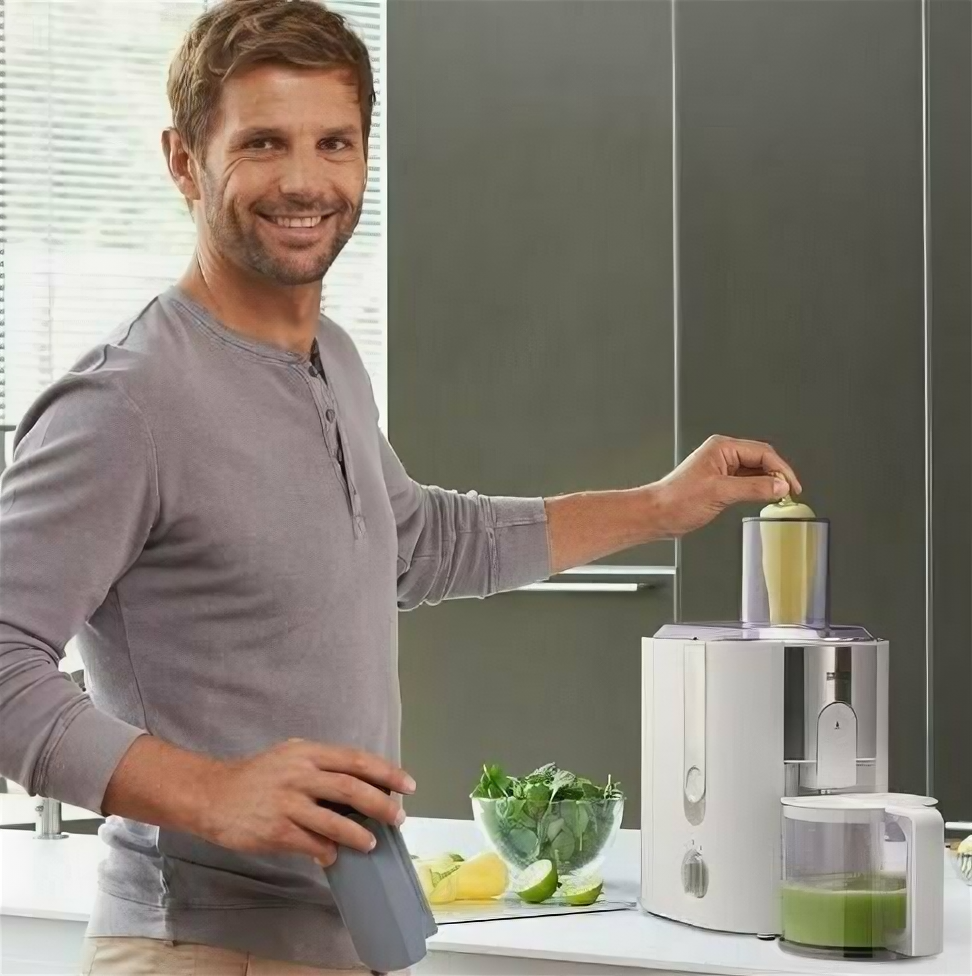 | Плюсы: | 1) Стильно смотрится на кухне. <br>2) Широкая горловина для загрузки цельных фруктов и овощей. <br>3) В комплекте есть щетка для чистки. <br>4) Вместительный контейнер для сброса жмыха. <br>Объема хватит для приготовления не мене 1.5 литров сока без его очистки. Больше не пробовал. <br>5) Система Капля-стоп. На деле - носик просто поворачивается под небольшим углом к верху, и небольшая перегородка естественным путем закрывает сток. Тем не менее, если с центрифуги сок продолжит стекать, то из горлышка может политься, даже если он приподнят. <br>6) По мне довольно тихая, звук не высокий, не писклявый, не противный, больше низкий и не раздражающий. <br>7) Таки мощная, но не прыгает при включении двигателя. <br>8) Жмых, например, от яблок и апельсинов очень сухой. Главное для определенной твердости фруктов включать соответствующую скорость (все в инструкции). |
