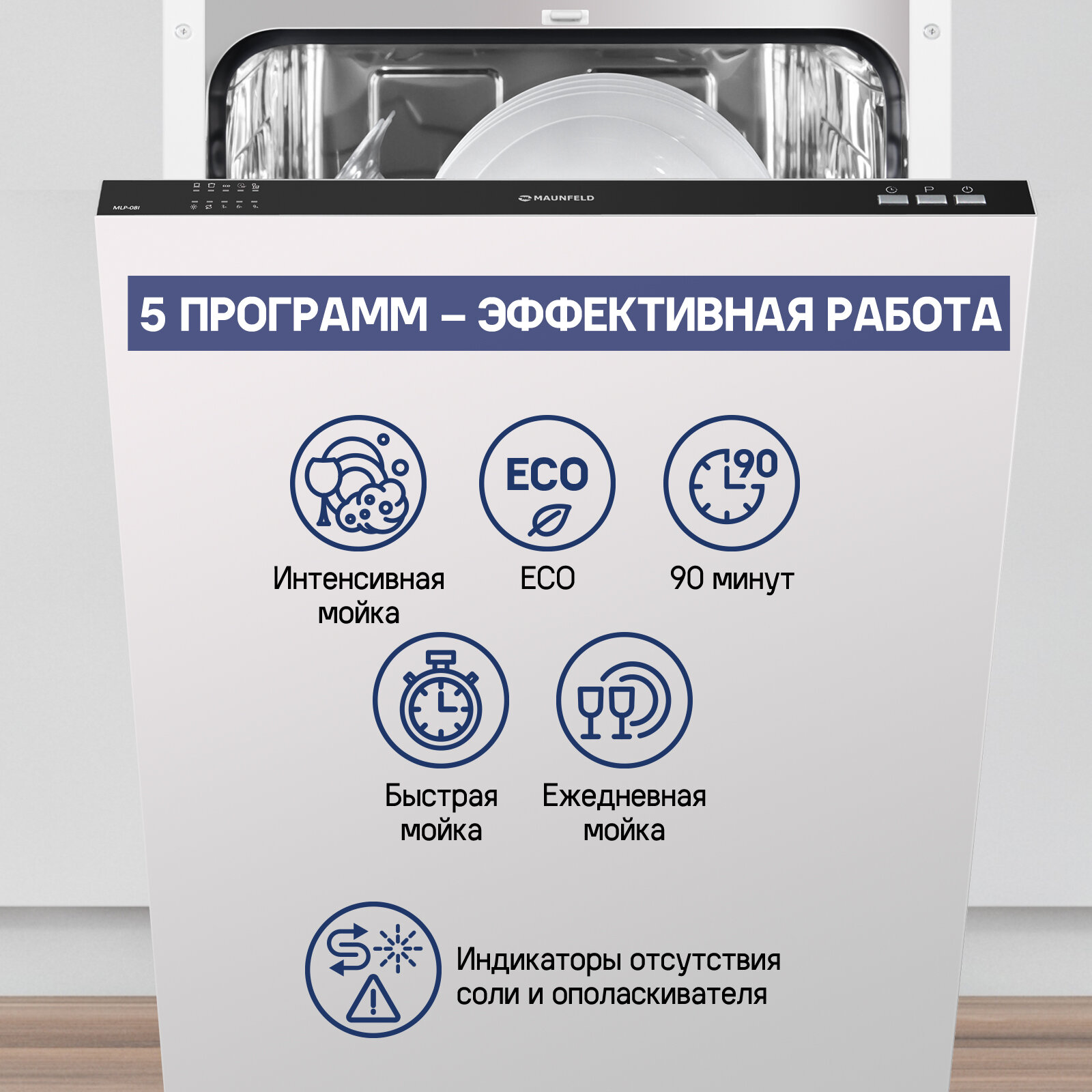 Посудомоечная машина Maunfeld MLP 08I, загрузка 9 комплектов посуды, количество программ 5, встраивается полностью (УТ000009300)