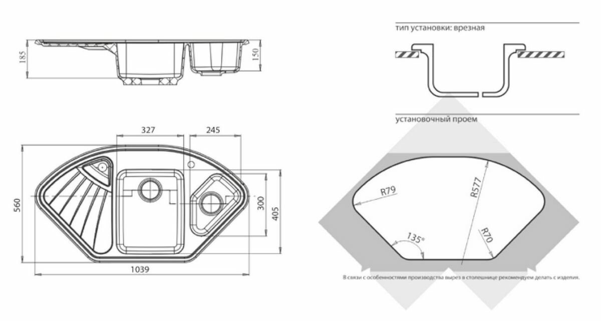 СохранитьМойка GRANFEST GF-C1040E 1,5 чаши, угловая 1040*560 мм (серый - 310) интересное: