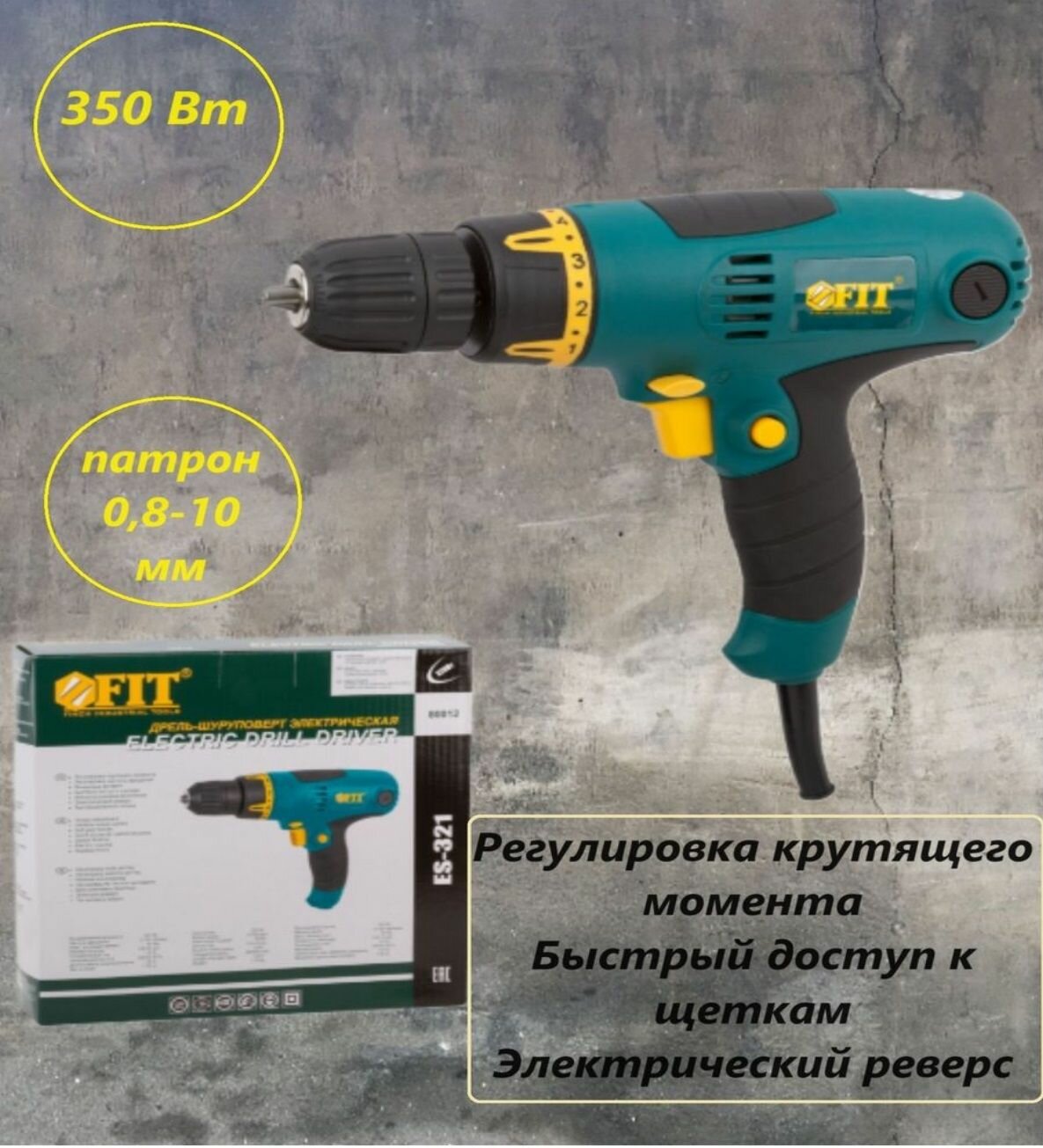 Дрель-Шуруповерт эл. 350 Вт; 0-700 об/мин; БзП 10 мм; рез. накл.; 22,0 Нм; 16+1; БС щеток; коробка, FIT 80012 (1 шт.)