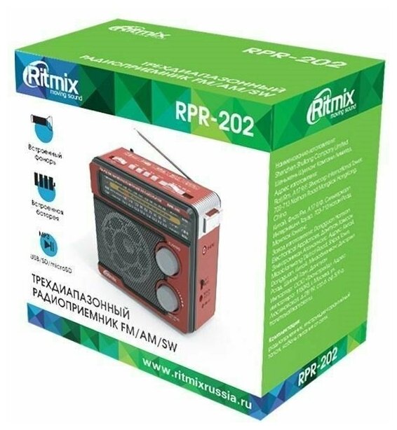 Радиоприемник Ritmix RPR-202 Red, диапазоны FM, СВ*AM, КВ*SW, usb, SD, MP3 плеер, фонарь - красный