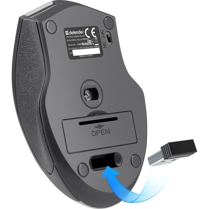 Беспроводная мышь Defender Acura MM-665, 6 кнопок, 800-1200 dpi, питание 2*ААА. радиус действия 10 м, серая