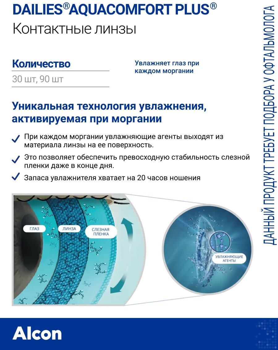 Контактные линзы Alcon, Dailies AquaComfort Plus, Однодневные, +2,25 / 14 / 8,7 / 30 шт.
