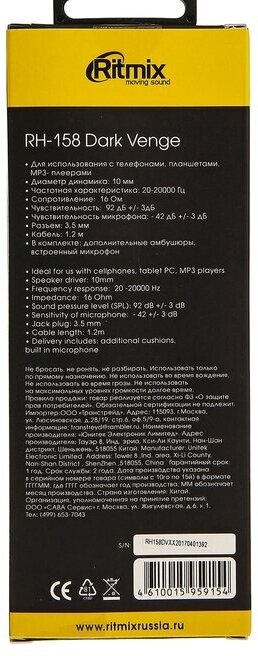 Ritmix RH-158 Dark Venge (внутриканальные, 20Гц-20кГц, 16Ом, 92 дБ/мВт, 3.5мм, кабель 1,2 м)