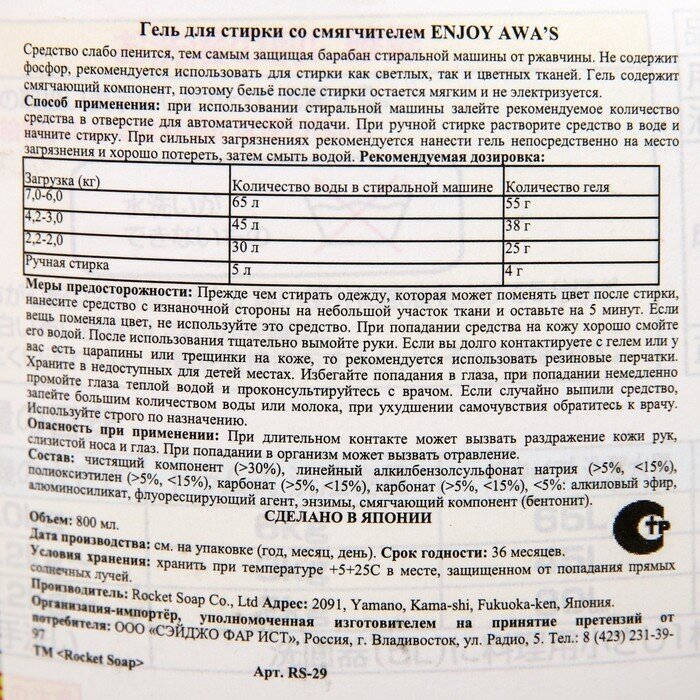 Rocket Soap Гель "Enjoy Awa's" для стирки со смягчителем (чарующий цветочный аромат) 0,8 кг