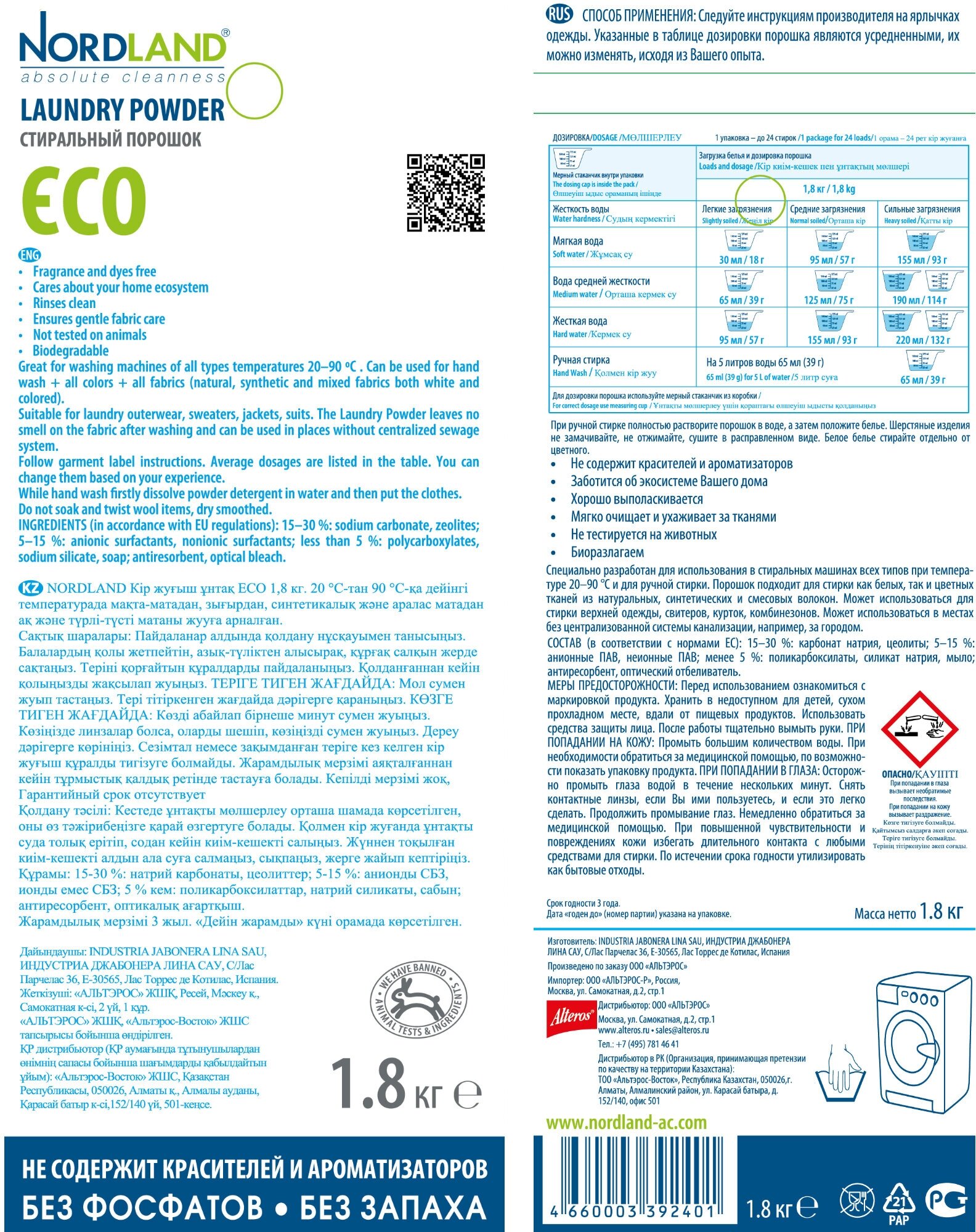 Nordland Стиральный порошок ECO без фосфатов и без запаха 1,8 кг на 36 стирки