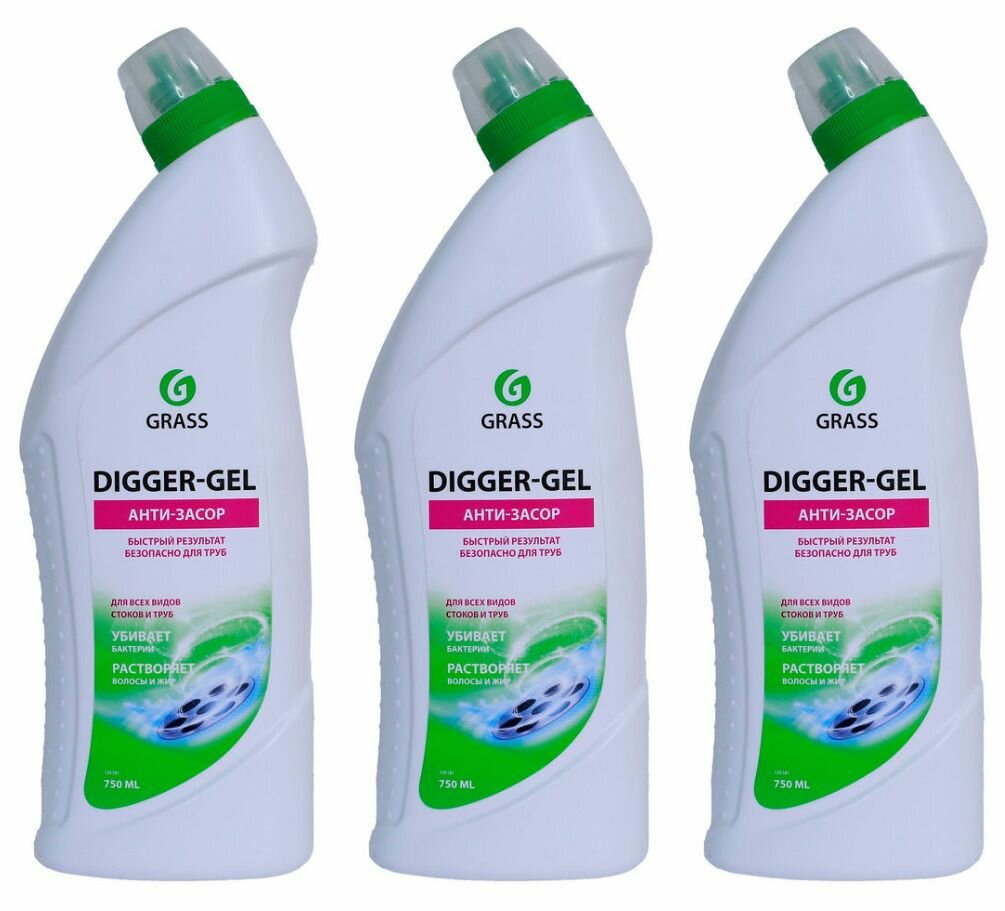 Grass средство для прочистки труб канализации Digger-Gel, 3 шт., 0.75 л