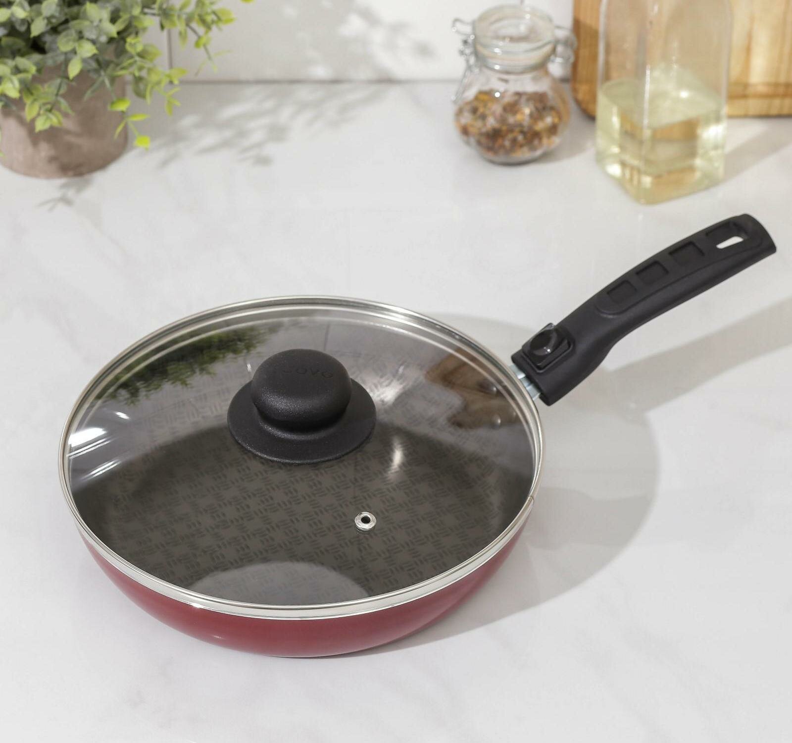Сковорода «Альфа» d=28 см съёмная ручка стеклянная крышка антипригарное покрытие цвет бордовый