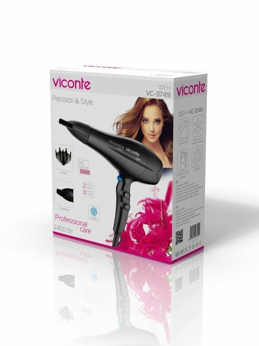 Фен для волос Viconte 2400 Вт для сушки и укладки с насадками диффузор и концентратор