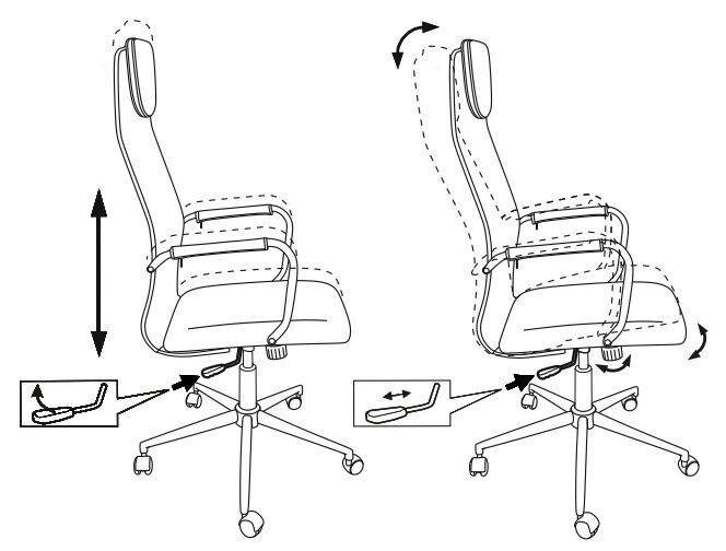 Есть стандартный газовый лифт и небольшая регулировка наклона спинки стандартным винтом внизу. Всё. На ручке газового лифта нарисованы какие-то движения влево и вправо, но на практике такие движения сделать невозможно. |