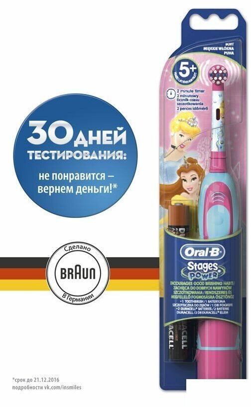 | Отзыв: | Электрическая зубная щетка Oral-B Stages Power подойдёт для самых самых маленьких принцесс.Купили для пятилетней дочки и она практически сразу к ней привыкла , как будто до этого пользовалась несколько лет. В обращении Oral b очень проста , не требуется что то настраивать. На корпусе расположена кнопка включения и выключения. Результатом чистки довольны #pgbonus |