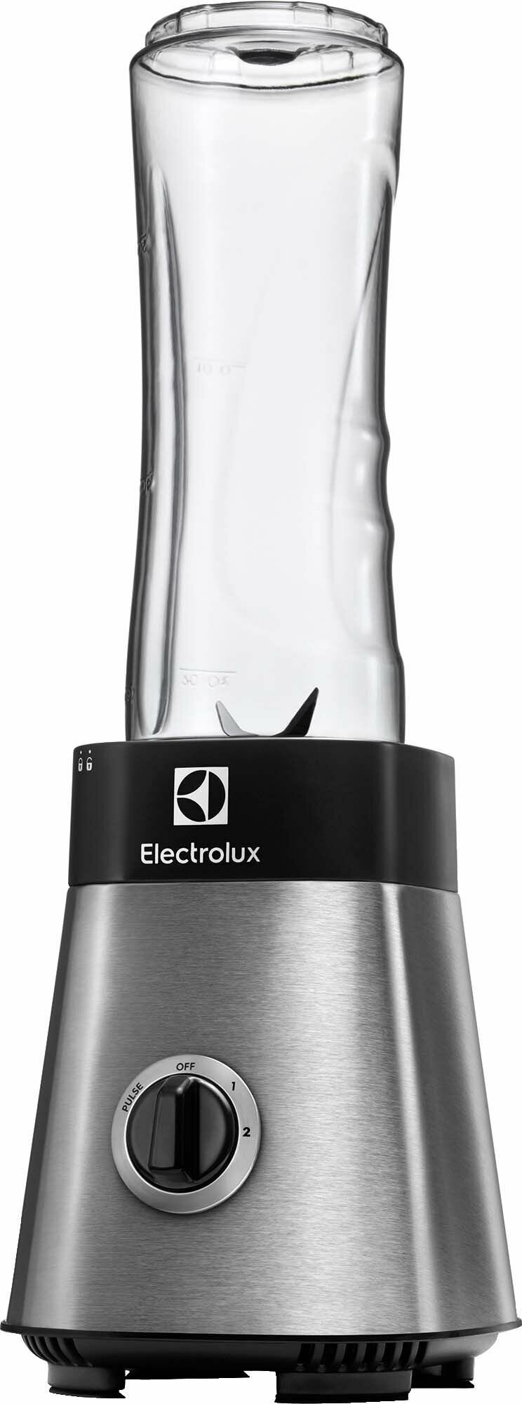 Блендер Electrolux/ Блендер настольный, мощность 400 Вт, съемный нож из нерж. стали с 4мя лезвиями, колба из Tritan 0,6 л. с крышкой, 2 бутылки емкостью по 300 мл с крышкой с ручкой, измельчитель, кофемолка. цвет нержавеющая сталь/черный