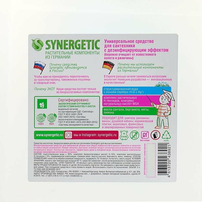 Средство для сантехники Synergetic концентрированное, без хлора 5л, 1 шт