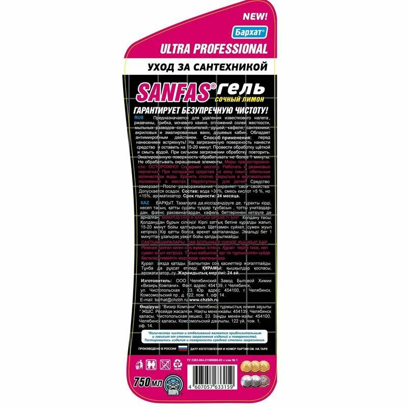 Средство чистящее для сантехники Barhat Ultra Sanfas Сочный лимон, гель, 750 г