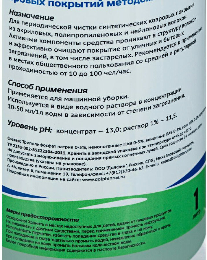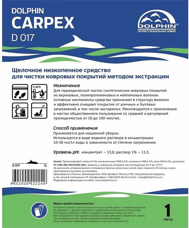 Промышленная химия Dolphin Carpex, 1л, средство для чистки ковровых покрытий, концентрат