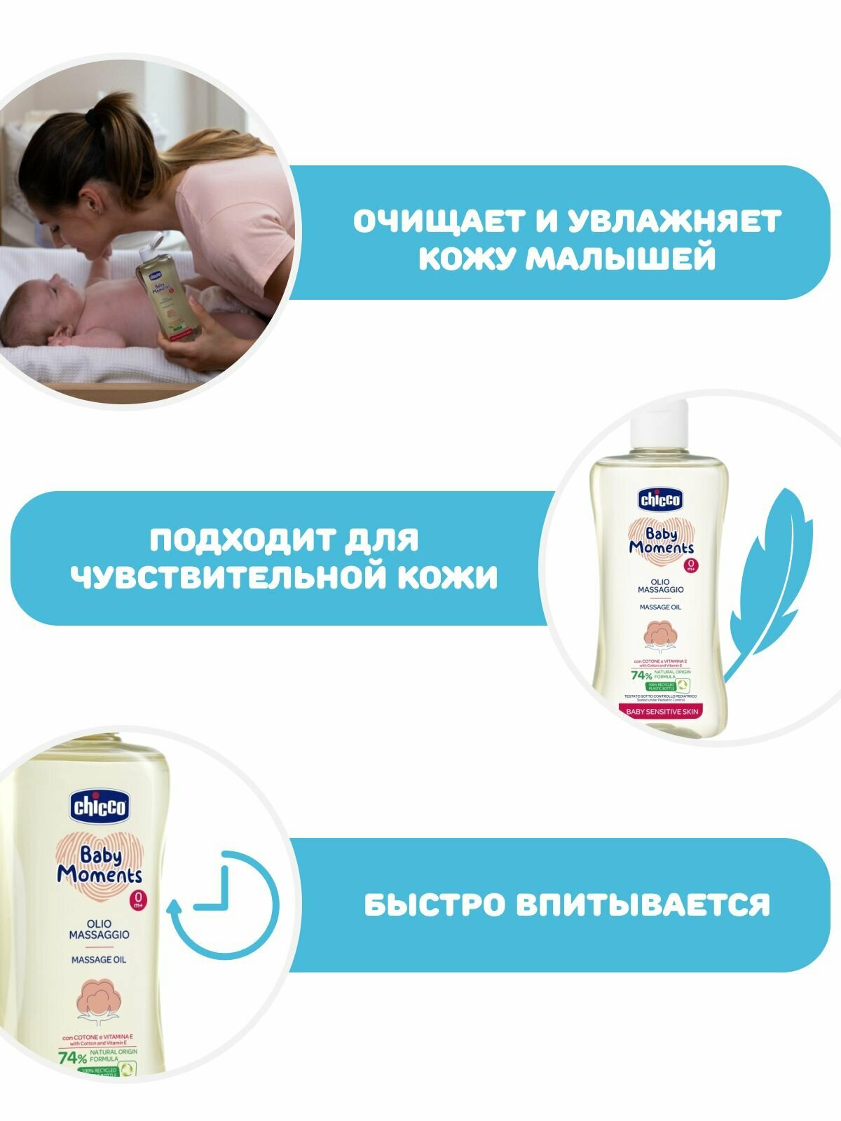 Детское масло для массажа тела Chicco Baby Moments для чувствительной кожи с хлопком и витамином Е 200 мл 0+
