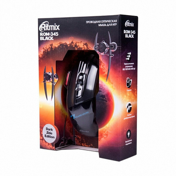 Мышь проводная оптическая RITMIX ROM-345 черная, игровая. USB. Разрешение: 800/1200/1600/2400 dpi. Кнопок: 6 + колесо кнопка. Длина кабеля 150 см.