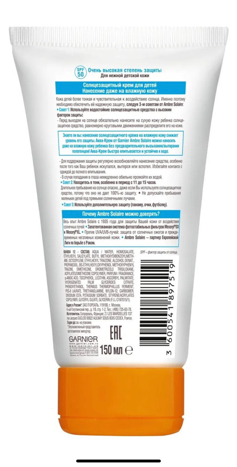 GARNIER Ambre Solaire детский солнцезащитный аква-крем SPF 50 150 мл