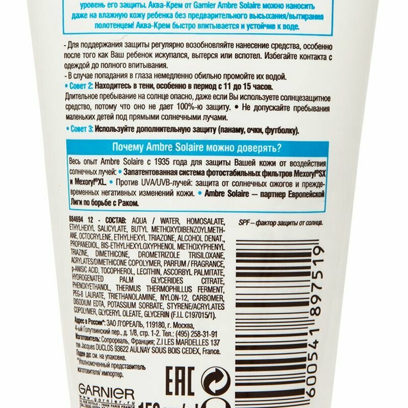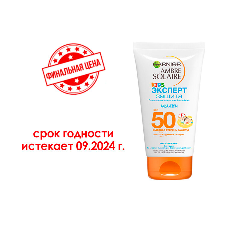Garnier Детский солнцезащитный Аква-Крем Ambre Solaire "Эксперт Защита KIDS", SPF 50, гипоаллергенный, 150 мл
