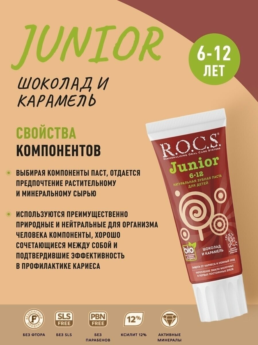 R.O.C.S. Junior зубная паста для детей 6-12 лет Шоколад и карамель, 74 гр