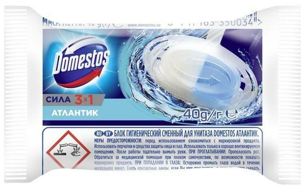 Гигиенический блок для унитаза Domestos "Атлантик", твердый, сменный блок, 40г (8717163350034)