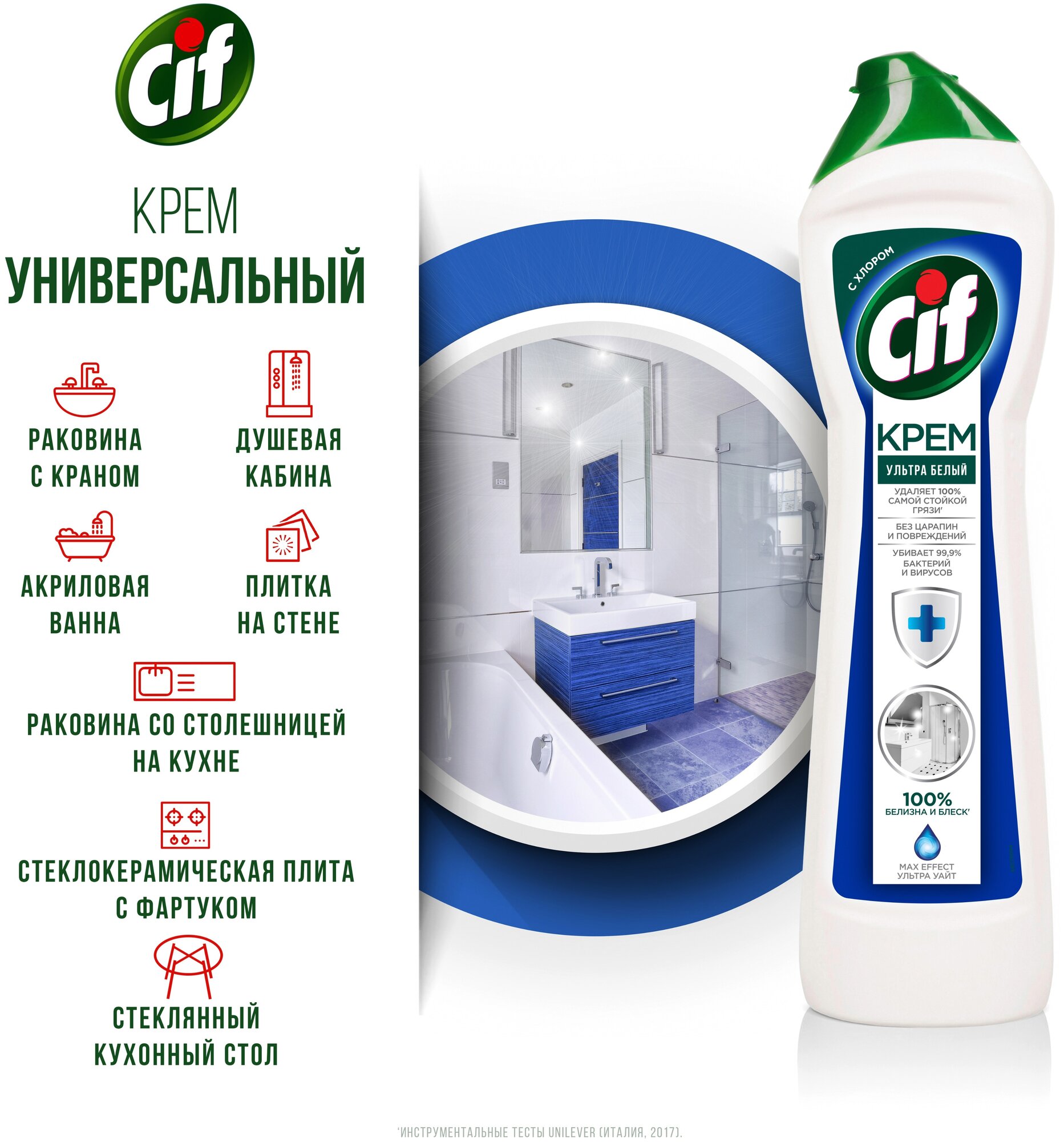 Чистящий крем Cif "Ультра Уайт", белизна, гигиена и блеск, обладает отбеливающим и антимикробным эффектом, 450 мл.