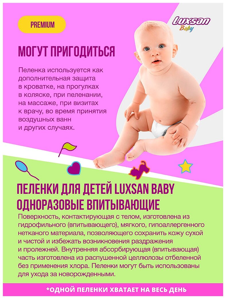 Пеленки одноразовые детские Luxsan Baby PREMIUM 60х90, 10 шт.