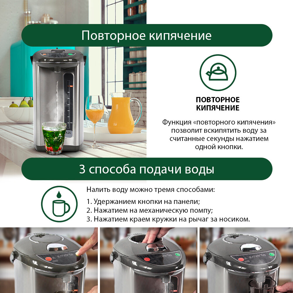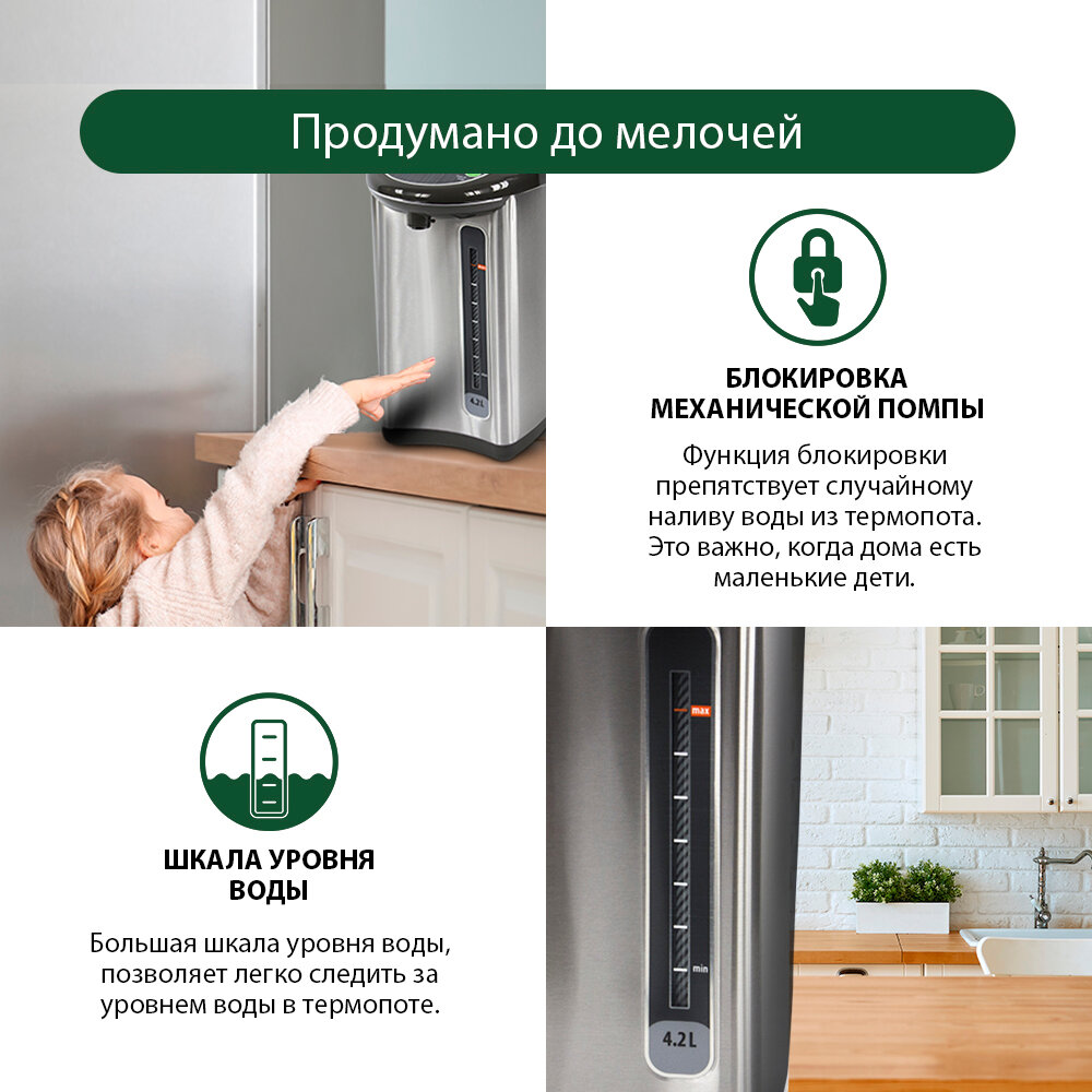 | Отзыв: | Купил такой термопот практически по цене чайника. Пользуюсь, пока доволен. Объём нормальный, 4 литра хватает более чем. Температуру держит хорошо. Стенки двойные, снаружи не нагревается. Помпа нормально работает. Без воды не включишь, срабатывает блокировка.