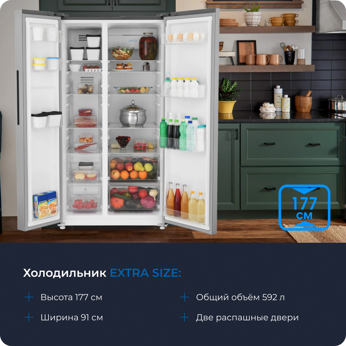 | Плюсы: | Вместительный, тихий, много дверных полочек, 4-е ящика в морозилке. |