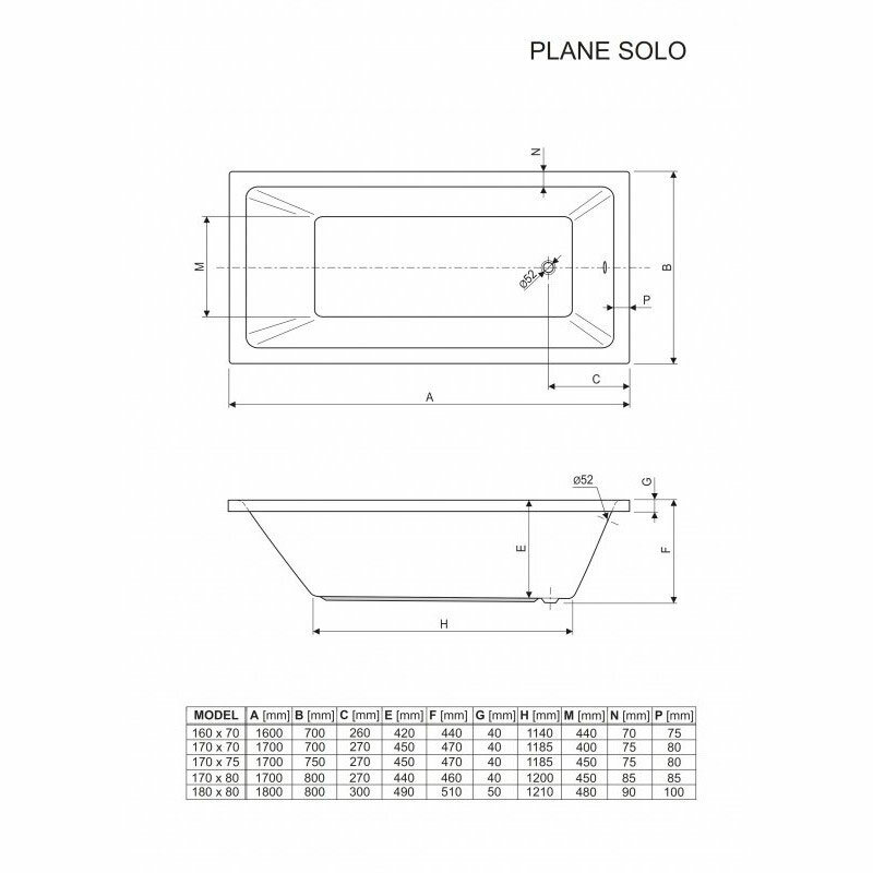 Акриловая ванна Cezares Plane Solo 170x75 PLANE SOLO-170-75-45-W37 белая
