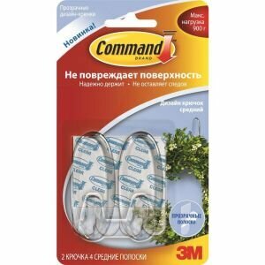 Дизайн-крючок прозрачный Command 3M 17091CLR, средний, 2 шт./4 полоски