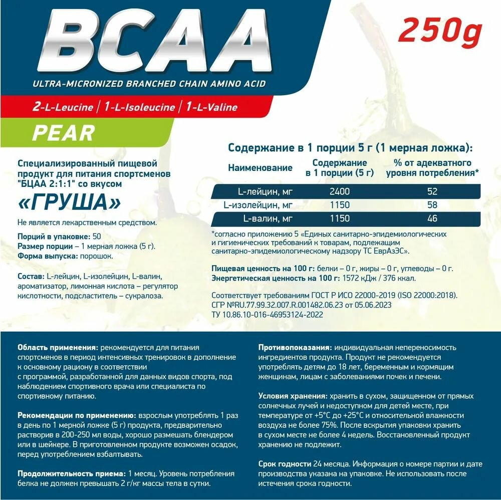 BCAA 2:1:1 250gr/50serv Pear (Груша) /Аминокислота ДС