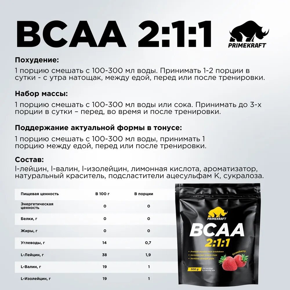 Аминокислоты PRIMEKRAFT BCAA 2:1:1 (БЦАА), Клубника, 500 г / 100 порций