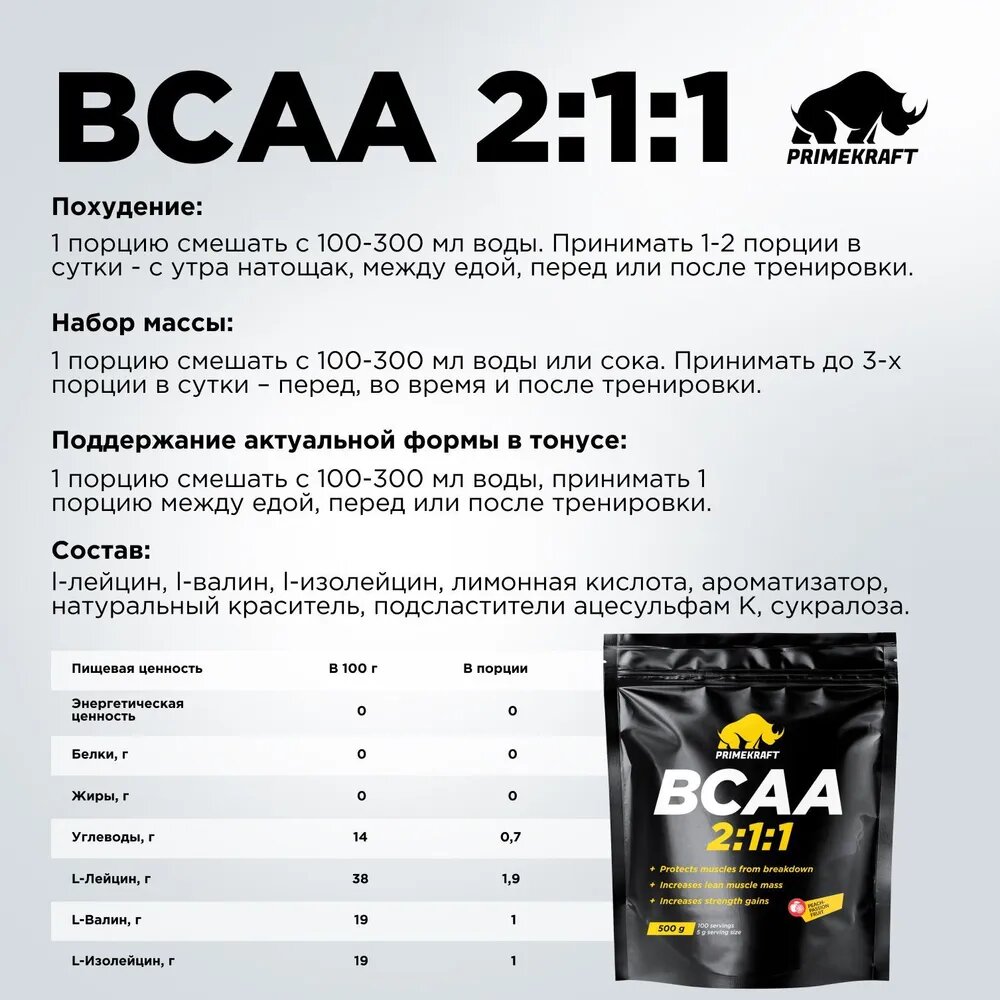 Prime Kraft BCAA 2.1.1, 500 g (персик маракуйя)