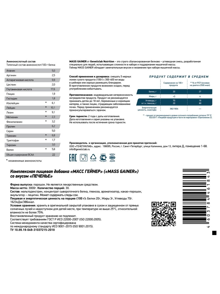 GeneticLab MASS GAINER 3000 гр (Печенье)