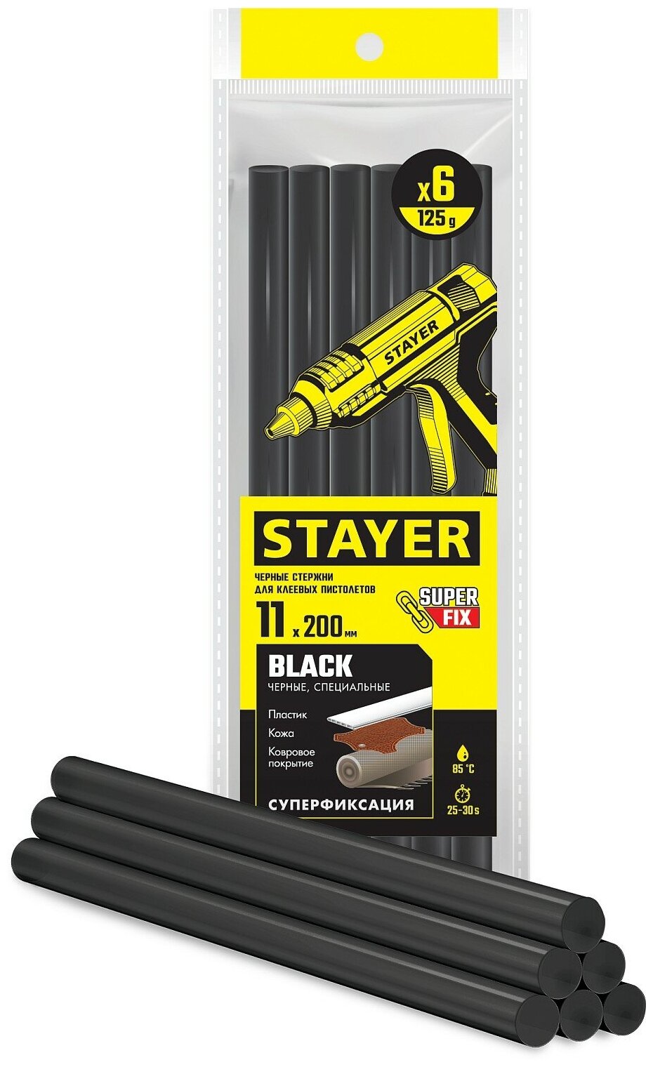 Черные клеевые стержни, d 11 мм х 200 мм 6 шт. 125 г. STAYER Black 2-06821-D-S06