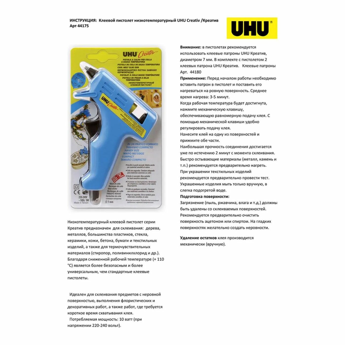 Клеевой пистолет низкотемпературный UHU Creativ / креатив термопистолет, блистер интересное: