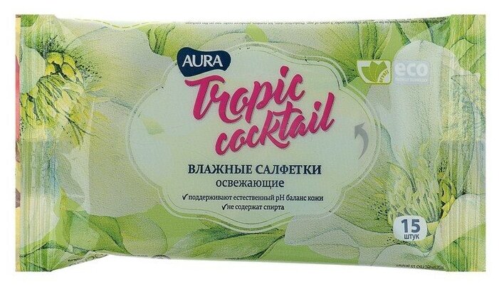 AURA Влажные салфетки Aura Tropic Cocktail, освежающие, микс, 15 шт.