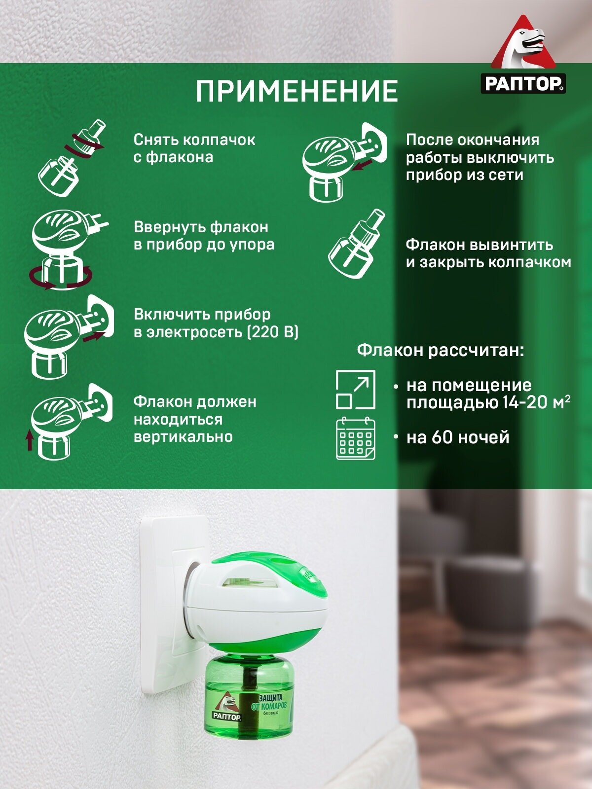 Жидкость для фумигатора Раптор от комаров, 40 г, 20 мл, 30 ночей, зеленый/белый