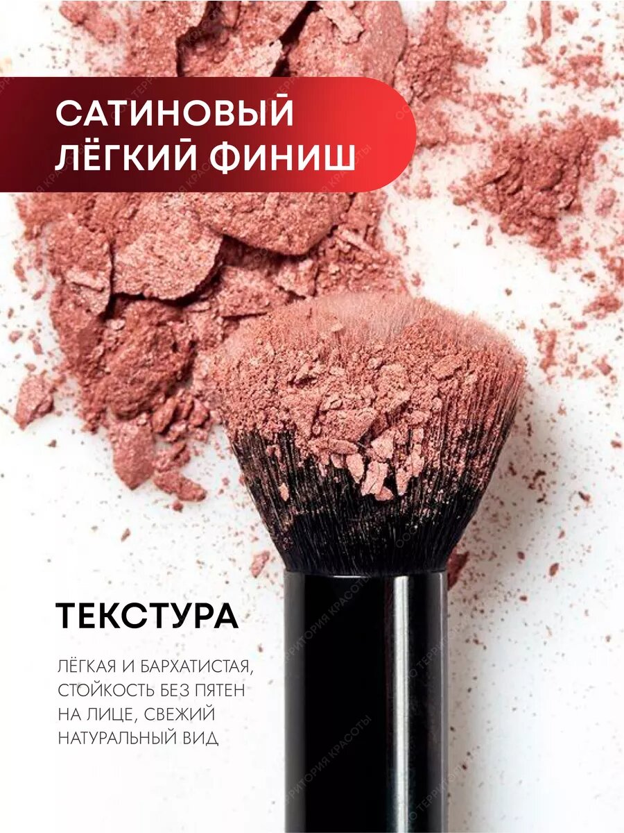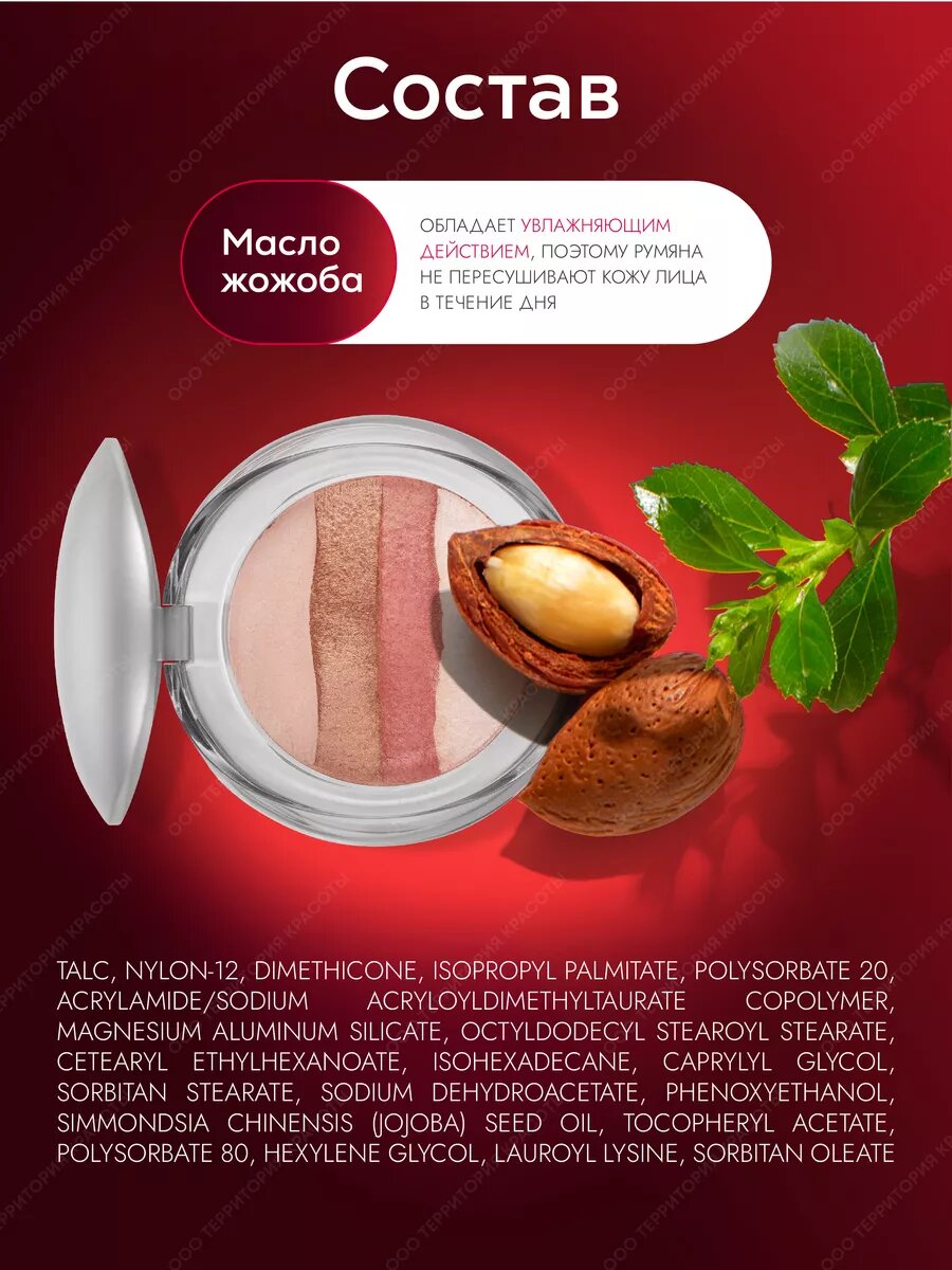 | Состав | TALC, NYLON-12, DIMETHICONE, ISOPROPYL PALMITATE, POLYSORBATE 20, ACRYLAMIDE/SODIUM ACRYLOYLDIMETHYLTAURATE COPOLYMER, MAGNESIUM ALUMINUM SILICATE, OCTYLDODECYL STEAROYL STEARATE, CETEARYL ETHYLHEXANOATE, ISOHEXADECANE, CAPRYLYL GLYCOL, SORBITAN STEARATE, SODIUM DEHYDROACETATE, PHENOXYETHANOL, SIMMONDSIA CHINENSIS (JOJOBA) SEED OIL, TOCOPHERYL ACETATE, POLYSORBATE 80, HEXYLENE GLYCOL, LAUROYL LYSINE, SORBITAN OLEATE (+/-) MAY CONTAIN: CALCIUM ALUMINUM BOROSILICATE, CALCIUM SODIUM BOROSILICATE, SYNTHETIC FLUORPHLOGOPITE, SILICA, CI 77019 MICA, CI 77891 (TITANIUM DIOXIDE), CI 77491,77492, 77499 (IRON OXIDES), CI 75470 (CARMINE), CI 77007 (ULTRAMARINES), CI 77163 (BISMUTH OXYCHLORIDE), CI 77288 (CHROMIUM OXIDE GREENS), CI 77289 (CHROMIUM HYDROXIDE GREEN), CI 77510 (FERRIC FERROCYANIDE), CI 77742 (MANGANESE VIOLET), CI 77861 (TIN OXIDE), CI 15850 (RED 6, RED 6 LAKE, RED 7, RED 7 LAKE), CI 45410 (RED 27, RED 28 LAKE), CI 73360 (RED 30, RED 30 LAKE), CI 16035 (RED 40 LAKE), CI 19140 (YELLO |